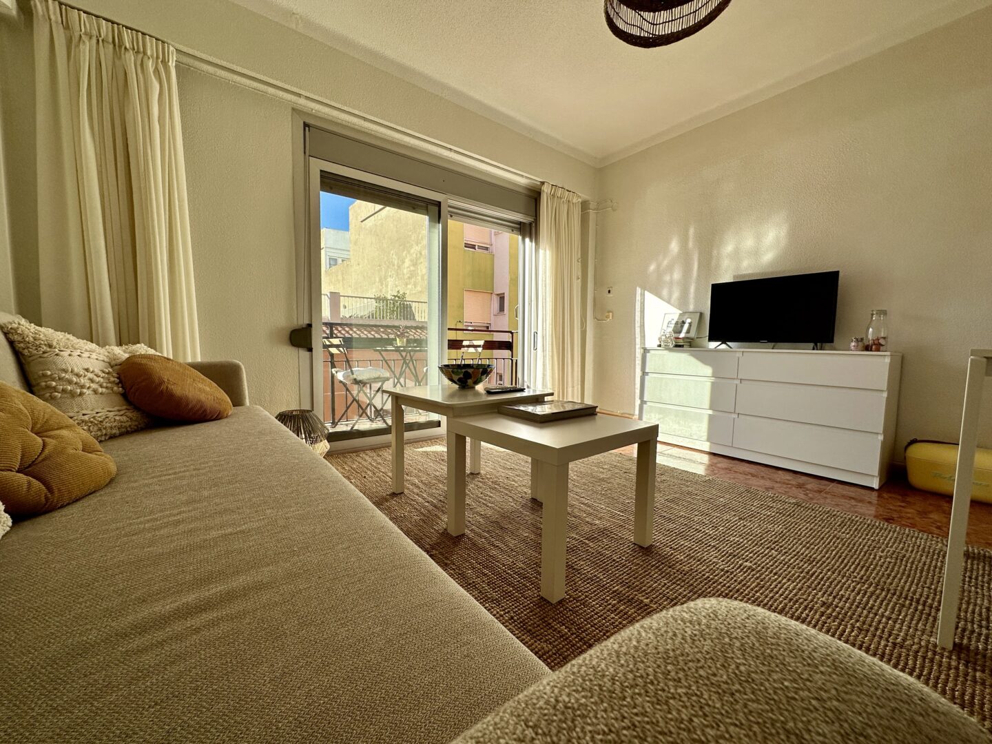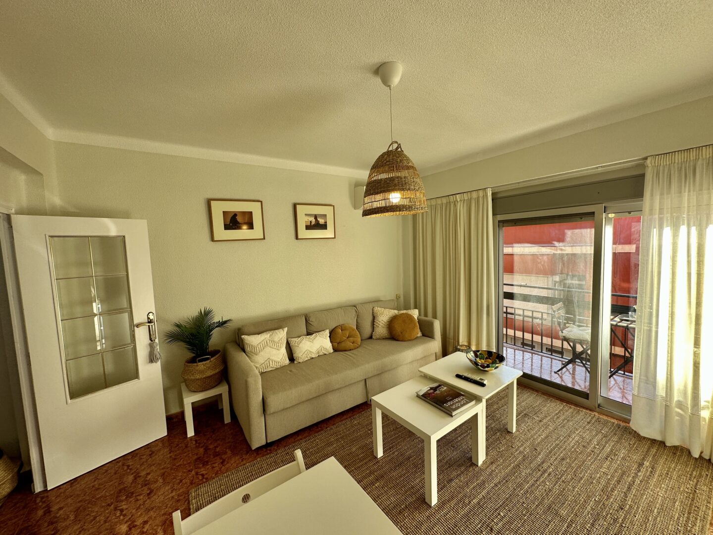 Bonito salón con salida a un balcón y vistas a la montaña.
